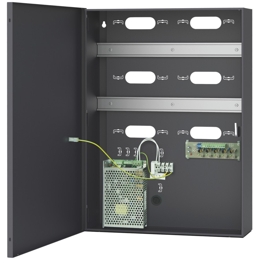 ME-43-S to metalowa obudowa do modułów i urządzeń systemu RACS 5 montowanych na dwóch szynach DIN TS-35; ma wbudowany zasilacz buforowy 13,8 V/4 A, moduł dystrybucji mocy, łącznik antysabotażowy i bezpiecznikowy rozłącznik zasilania 5 A. Przewidziano miejsce na akumulator 17 Ah..