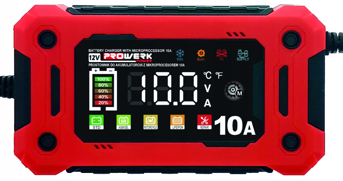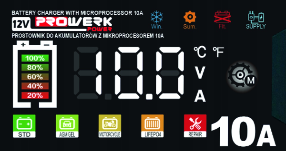 - Model: Z FUNKCJĄ NAPRAWY AKUMULATORÓW 12V 10A