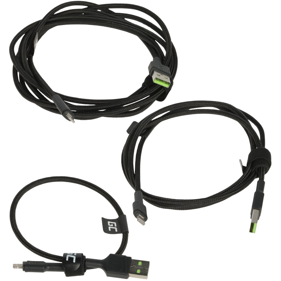Zestaw trzech kabli KABGCSET05 o długości 200 cm, 120 cm oraz 30 cm zapewnia szybkie ładowanie zgodne z Apple 2.4A oraz transfer danych do 480 Mbps. Wtyki Lightning posiadają delikatne, białe podświetlenie LED ułatwiające podłączanie w ciemności, a wielowarstwowy oplot z polipropylenu i kevlarowe włókna zwiększają wytrzymałość przewodów..